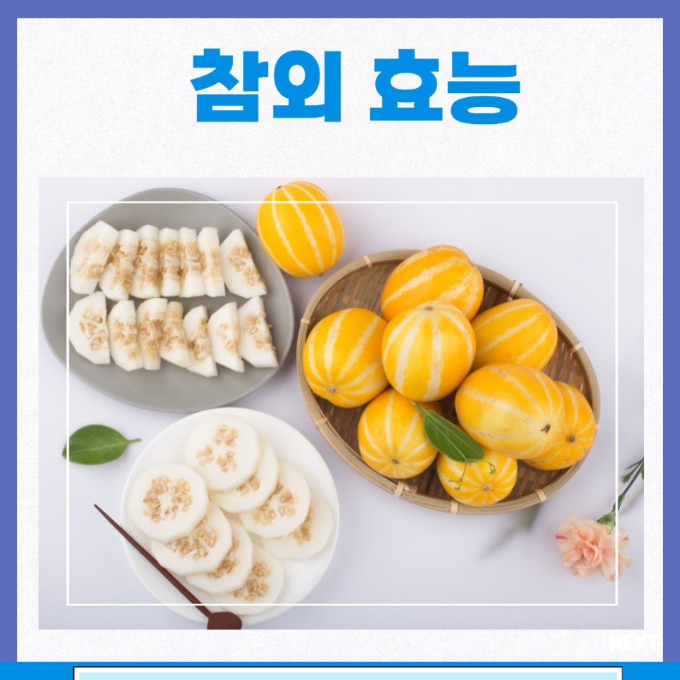 참외의 씨 부분에 많은 팔미트산, 스테라인 산 등 각종 유지성분이 요통와 변비에 좋은 효과가 있습니다.